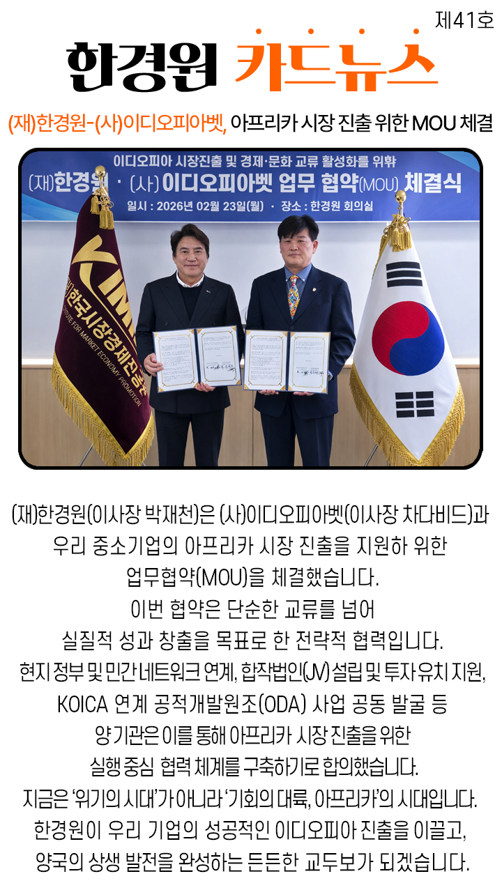 41. 이디오피아뱃 MOU 페이지 정보 작성자 댓글 0건 조회 14회 작성일 26-02-23 17:00 목록 본문 41. 이디오피아뱃 MOU 이전글42. 한중경제협회 신년 26.03.05 다음글40. 홍미희 전문위원님 출간 26.02.23 댓글 0 댓글목록 등록된 댓글이 없습니다.