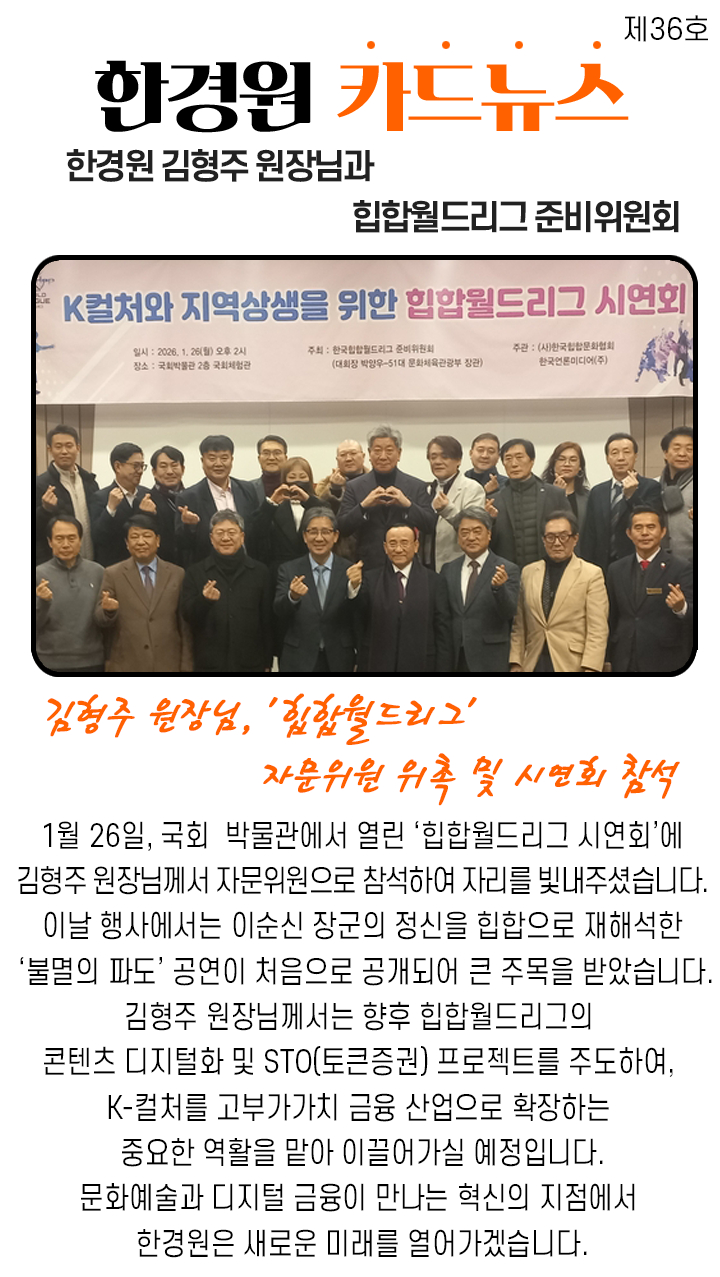 36. 힙합월드리그 페이지 정보 작성자 댓글 0건 조회 19회 작성일 26-01-29 10:21 목록 본문 36. 힙합월드리그 관련링크 https://www.yna.co.kr/view/AKR20260126144700371?section=culture/perfor… 10회 연결 이전글37. 제주 MRO 사업(김만기 전문위원님) 26.02.02 다음글한중경제협회와의 MOU 체결 26.01.16 댓글 0 댓글목록 등록된 댓글이 없습니다.